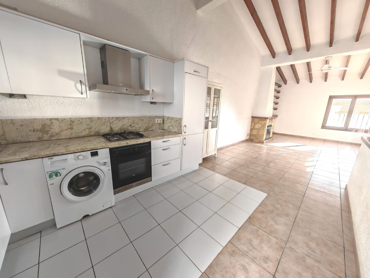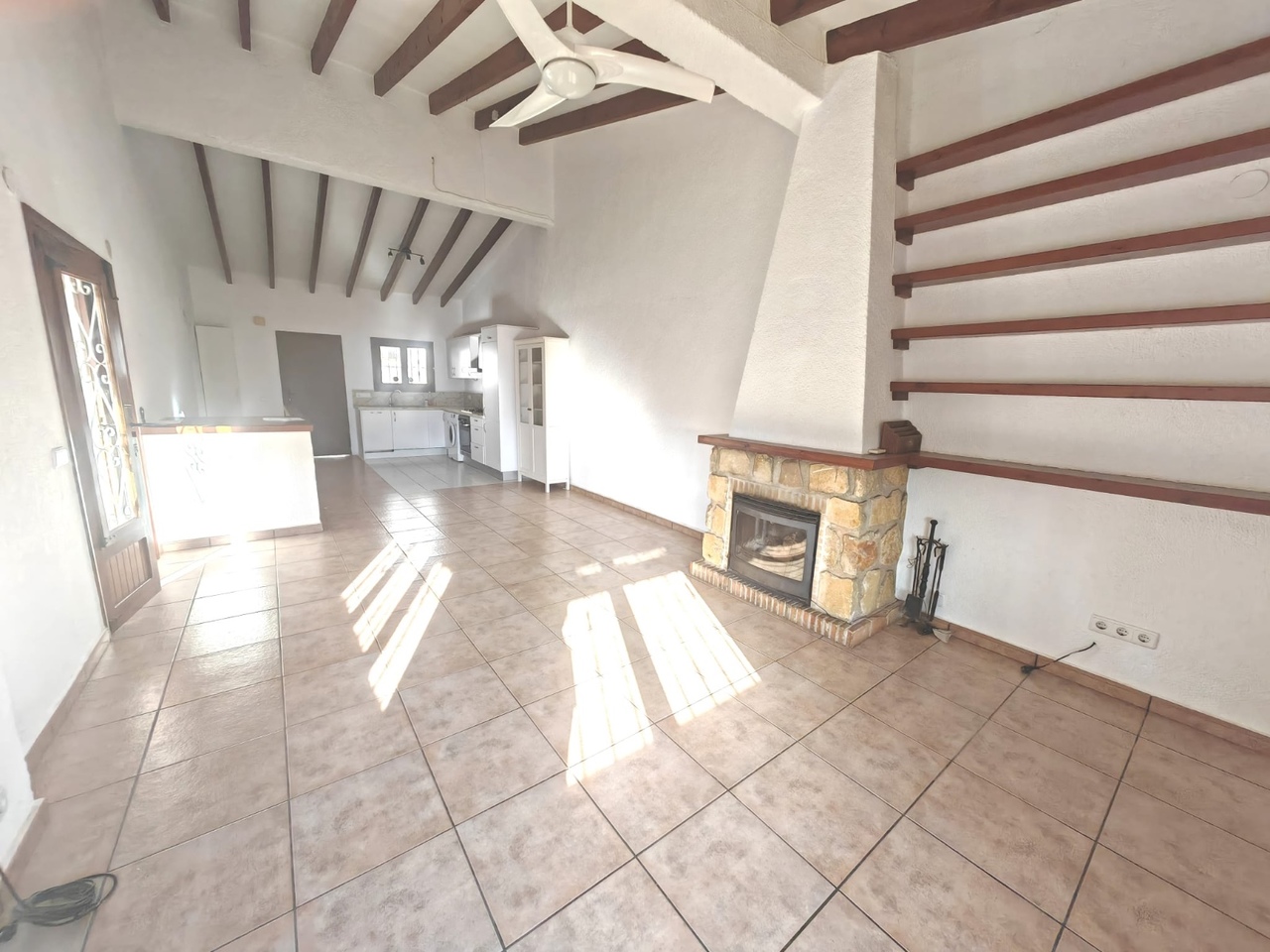 Bij binnenkomst wordt u verwelkomd door een ruime, volledig uitgeruste, open keuken die naadloos overgaat in de eetkamer en de ruime woonkamer. De woonkamer is voorzien van een gezellige open haard, een plafondventilator en airconditioning, waardoor u het hele jaar door kunt genieten van een aangenaam klimaat. Vanuit de woonkamer heeft u toegang tot een heerlijk terras, voorzien van een parasol die over de gehele ruimte loopt. Het biedt een vrij uitzicht en is de ideale plek om buiten te ontspannen.